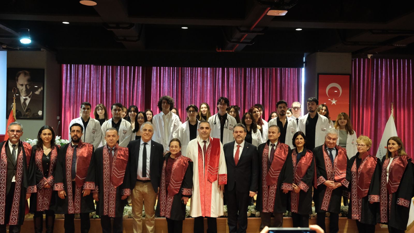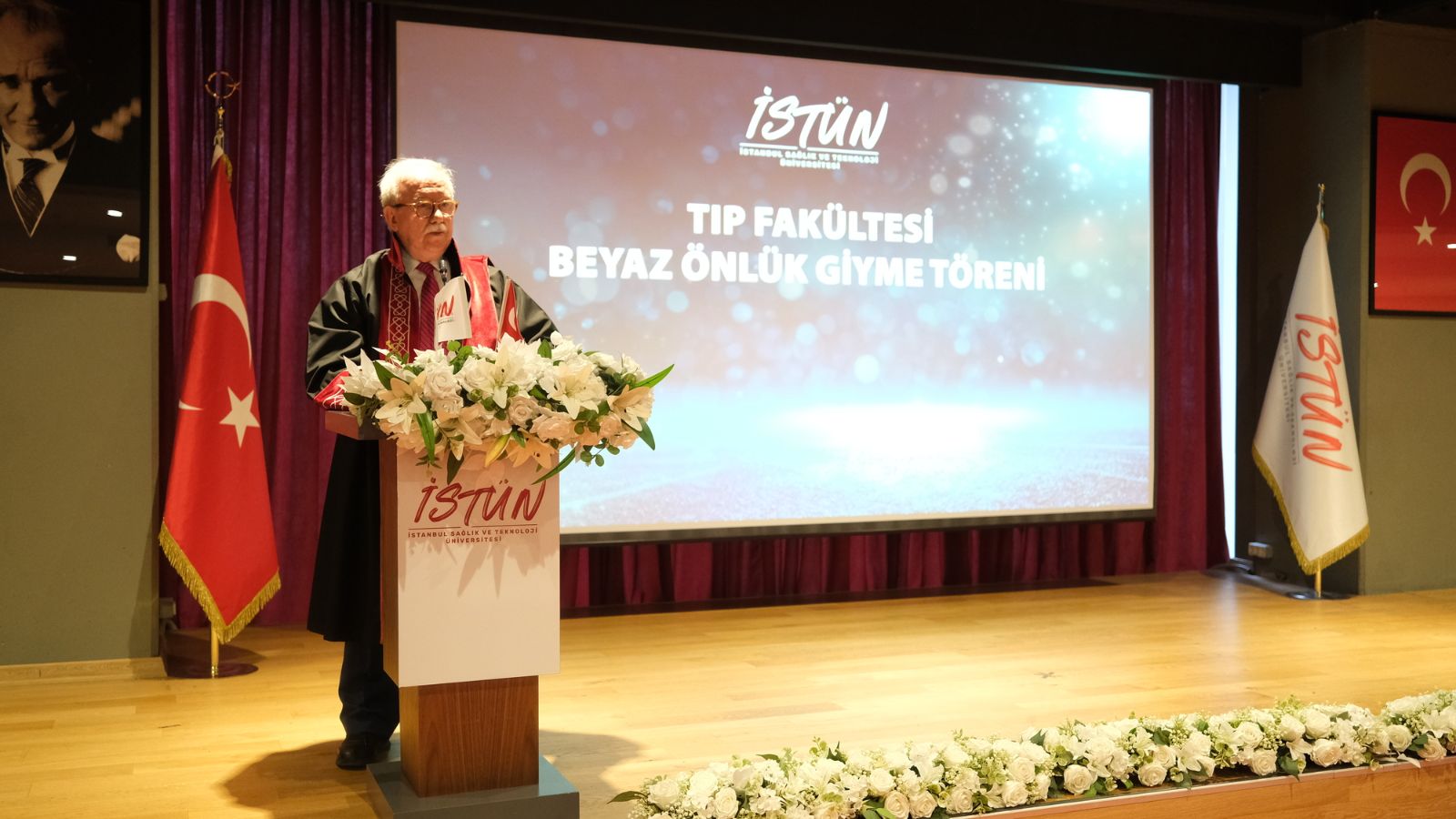 Saygı duruşu ve İstiklal Marşı’nın ardından başlayan törende İstanbul Sağlık ve Teknoloji Üniversitesi Rektörü Prof. Dr. Buğra Özen, rektör yardımcıları ve davetli konuklar öğrencilere hitap etti. Rektör Prof. Dr. Buğra Özen konuşmasında üniversitenin eğitim vizyonuna ve hekimlik mesleğinin taşıdığı sorumluluğa değinerek genç hekim adaylarına önemli mesajlar verdi. Hekimliğin yalnızca bilimsel bilgiyle değil, aynı zamanda güçlü etik değerlerle şekillendiğini vurgulayan Prof. Dr. Özen, konuşmasını Gazi Mustafa Kemal Atatürk’ün “Beni Türk hekimlerine emanet ediniz.” sözüyle tamamladı.