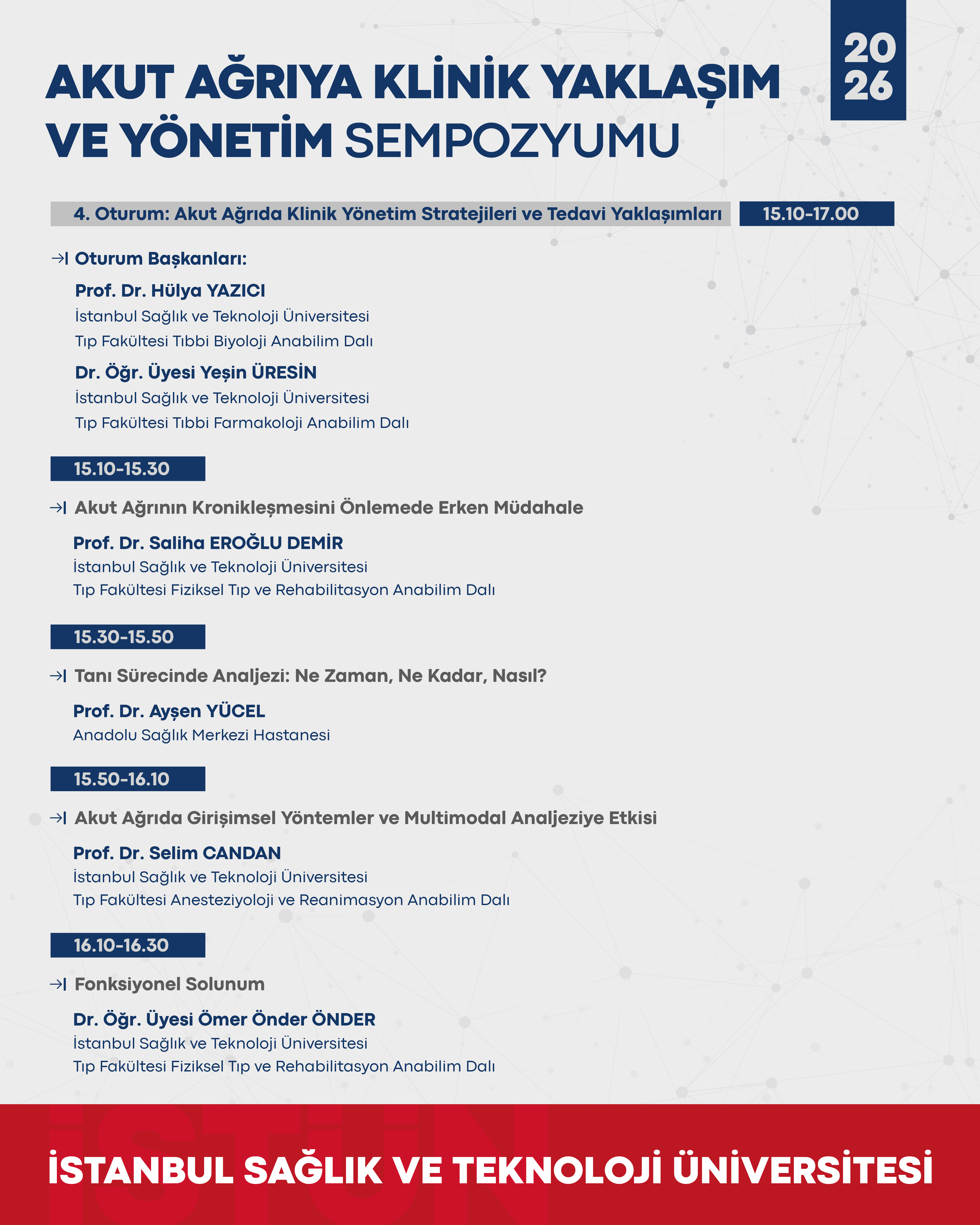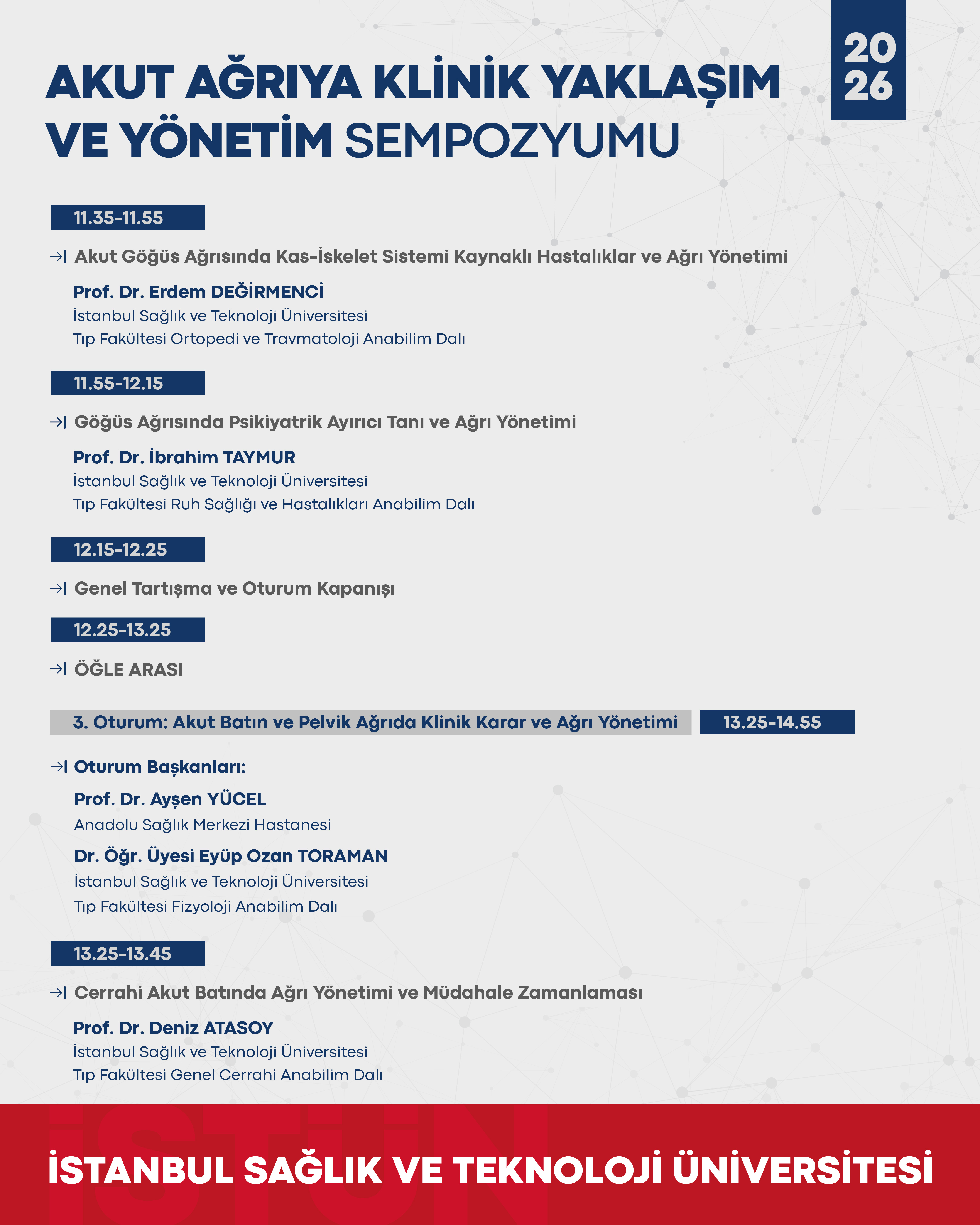 Akut ağrı, yalnızca bir semptom olmanın ötesinde, altta yatan ciddi hastalıkların ilk belirtisi olabilmesi nedeniyle zamanında ve doğru değerlendirilmesi hayati önem taşımaktadır. Bu sempozyumda; akut ağrının fizyolojik temellerinden başlayarak klinik değerlendirme yöntemleri, tanısal yaklaşımlar ve güncel tedavi stratejileri kapsamlı bir şekilde ele alınacaktır.
