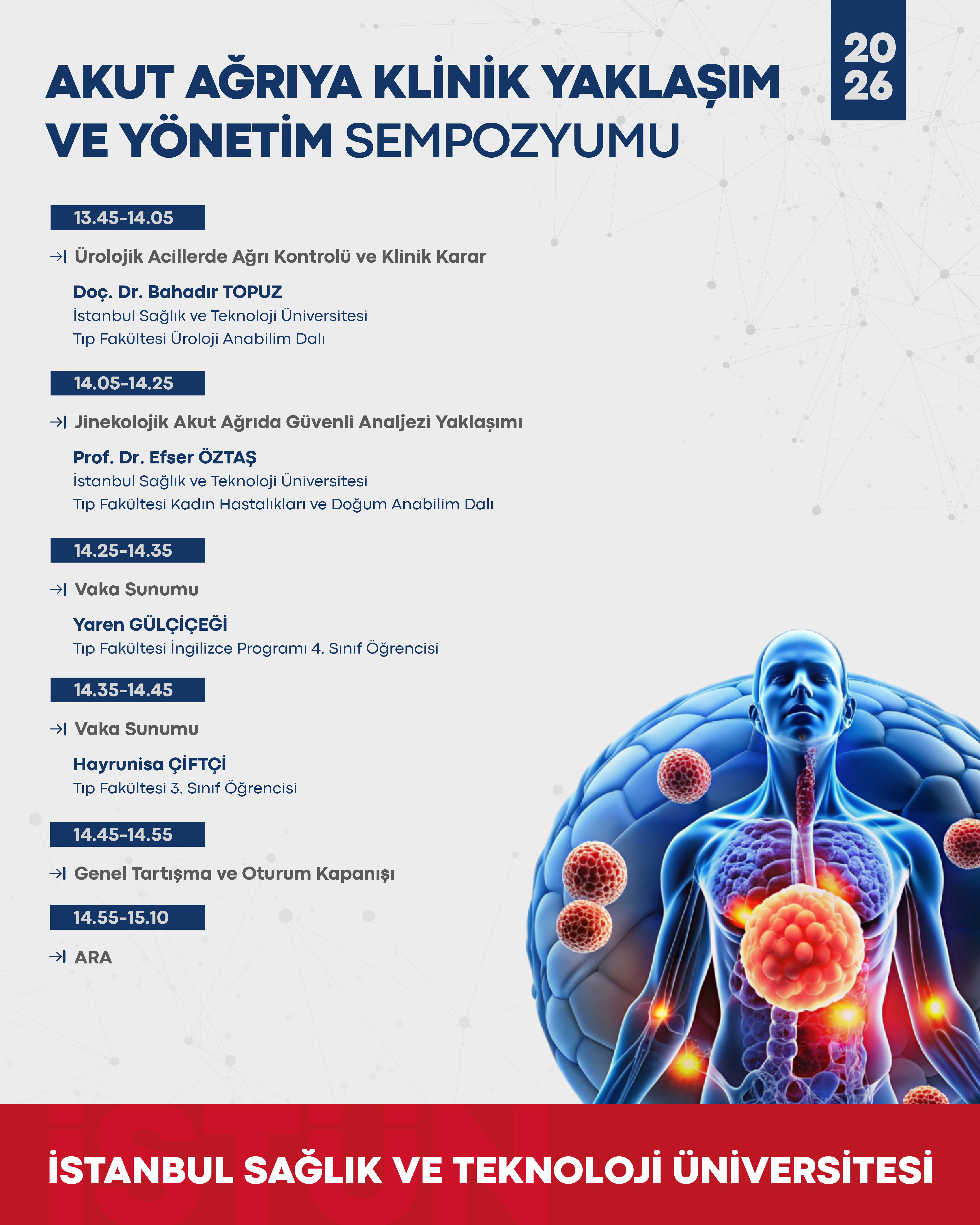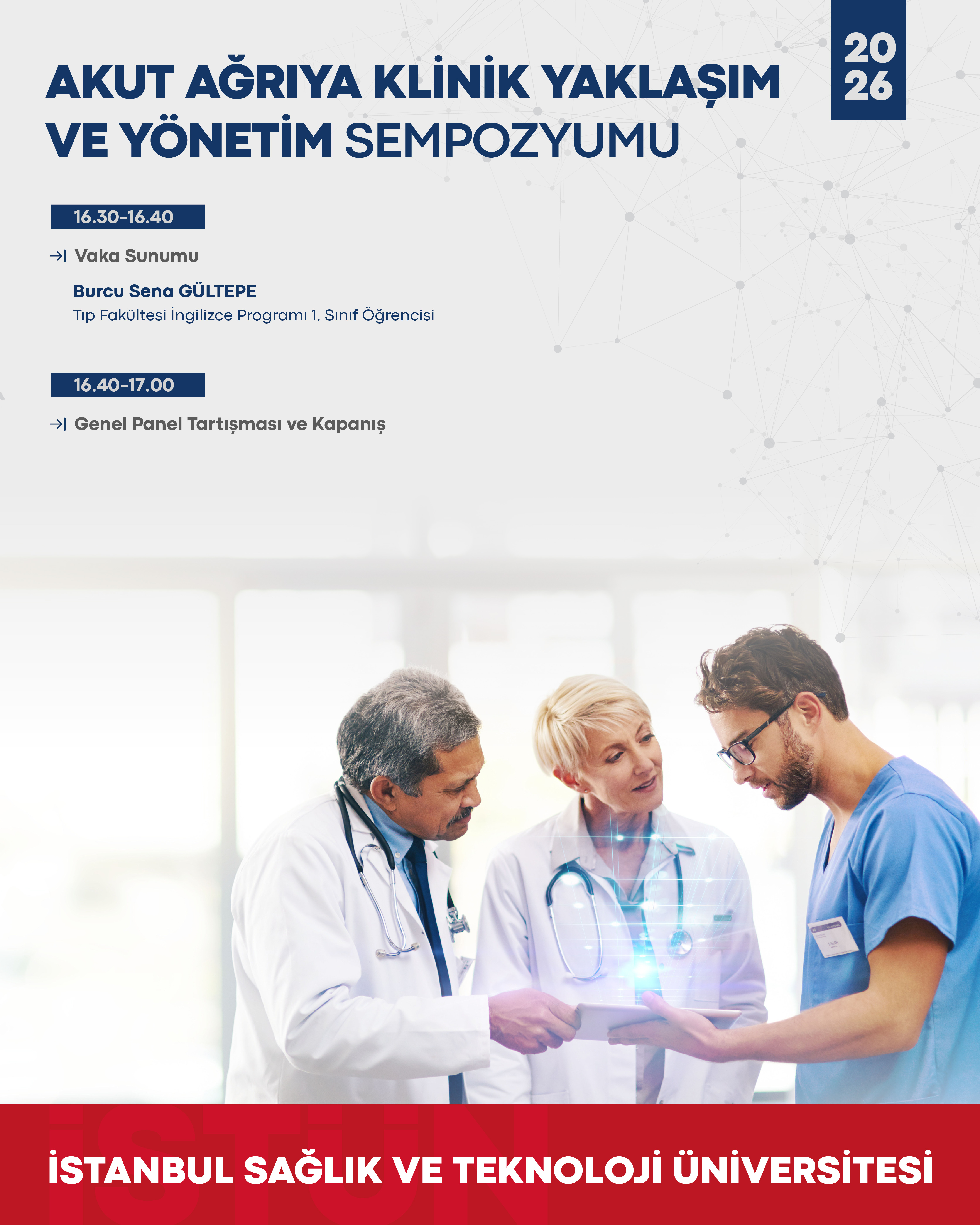 Tıp Fakültesi tarafından düzenlenen “Akut Ağrıya Klinik Yaklaşım ve Yönetim Sempozyumu” 17 Nisan 2026 Cuma günü 09.00-17.00 saatleri arasında Oditoryumda gerçekleştirilecektir. Etkinlik klinik pratiğin en sık karşılaşılan, hızlı değerlendirme gerektiren konularından biri olan akut ağrıya bütüncül bir bakış sunmayı amaçlamaktadır.