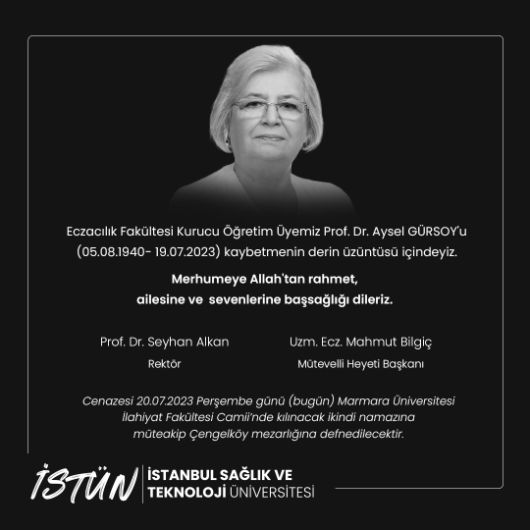 Eczacılık Fakültesi Kurucu Öğretim Üyemiz Prof. Dr. Aysel GÜRSOY''u Kaybetmenin Derin Üzüntüsünü Yaşıyoruz
